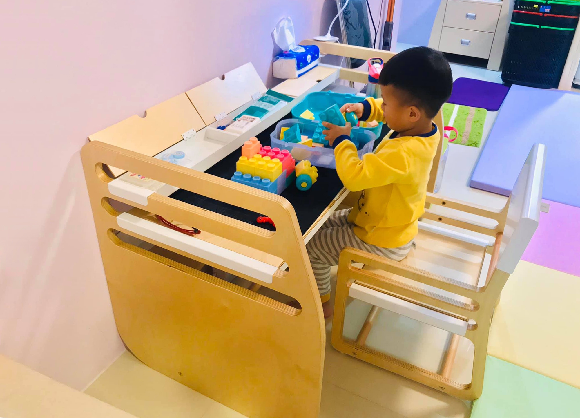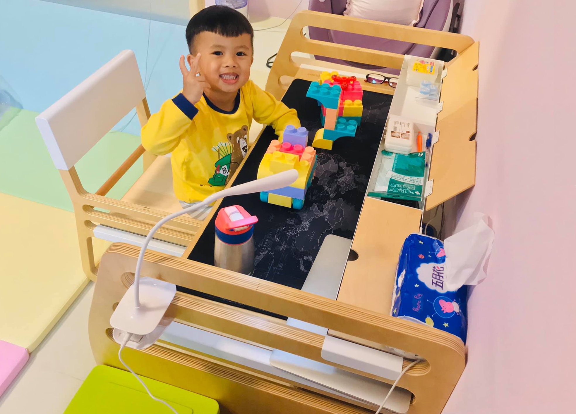選擇走走成長桌的原因,因為它的桌椅有三到四段高度調整,可以因應孩子不同的年齡來調整段數,很符合成長中孩童的需求,木質夾板及金屬板金收邊都很用心,質感相當好。設計的組裝簡單,專利卡榫計算很精密不馬虎,組裝完成使用上很穩固、紮實。