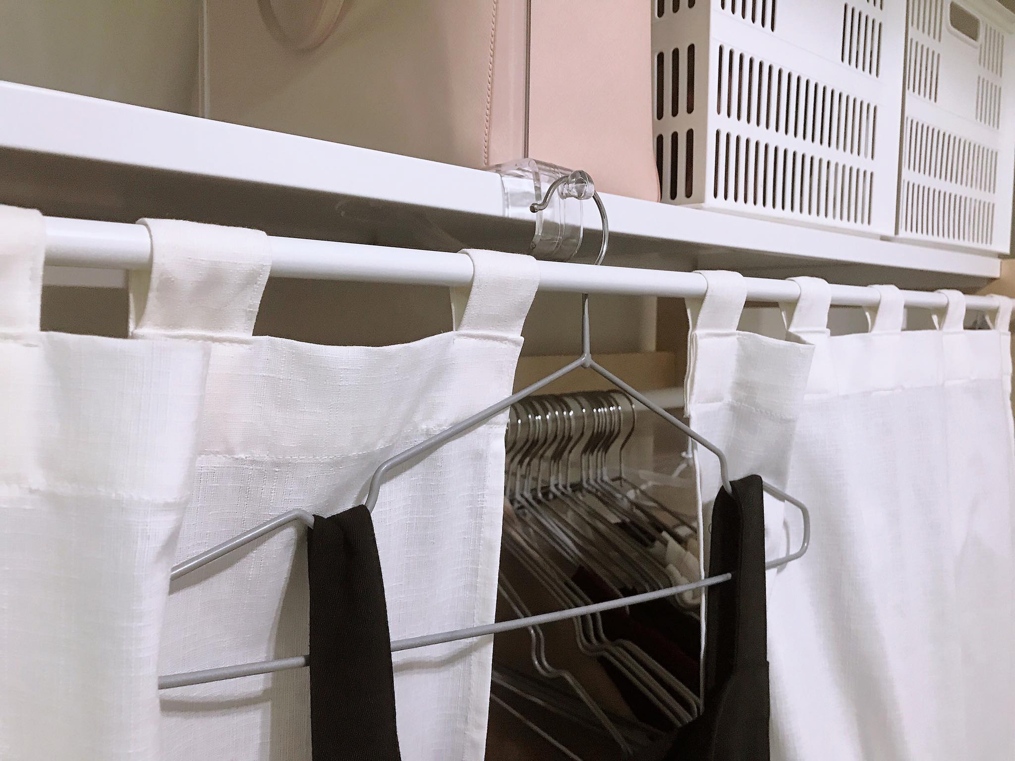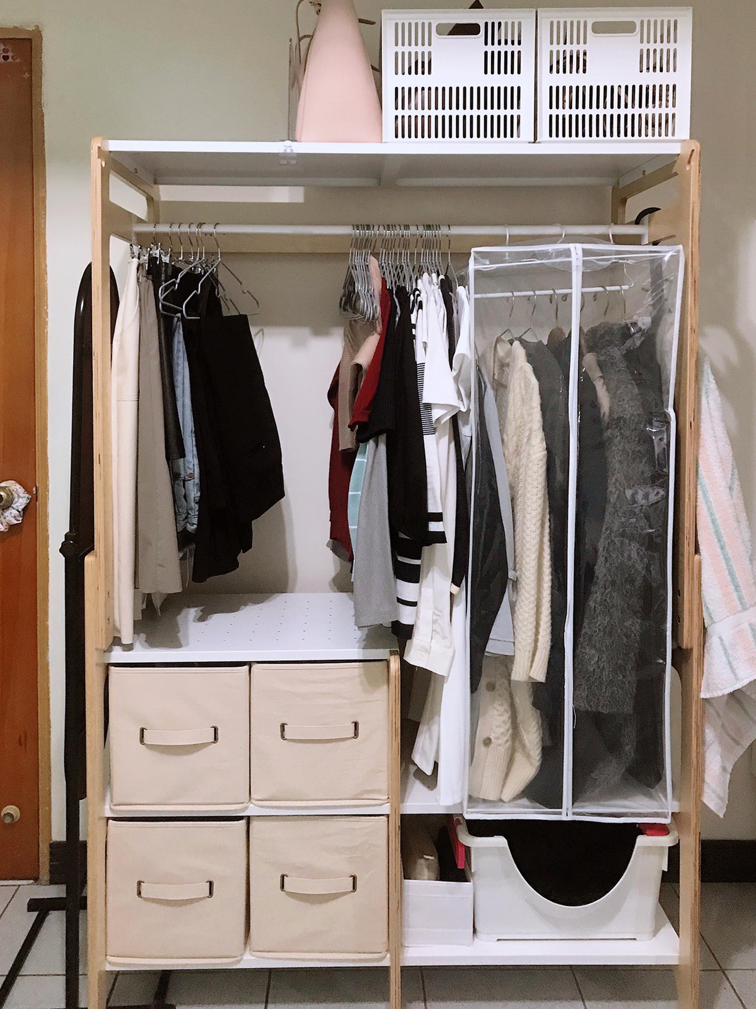 ▲ 先來一張沒有簾子遮住的全景圖。提醒大家一定要加裝布簾啊!!!我已經很強迫症了把衣服按照長短顏色擺,但五顏六色的衣服放進去還是會顯雜(雙手一攤)
