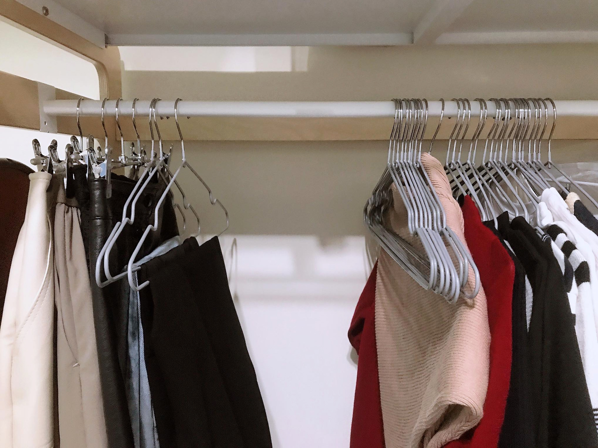 ▲ 下半身在左邊,上半身在右邊,中間是楚河漢界。裙子是用有兩個夾子的那種衣架。統一衣架應該是鐵律了,不需要贅述吧(但還是說了),然後空衣架別忘了集中放。話說防滑衣架好看但拿衣服很麻煩,可以的話還是買不鏽鋼的吧,我好後悔換掉喔