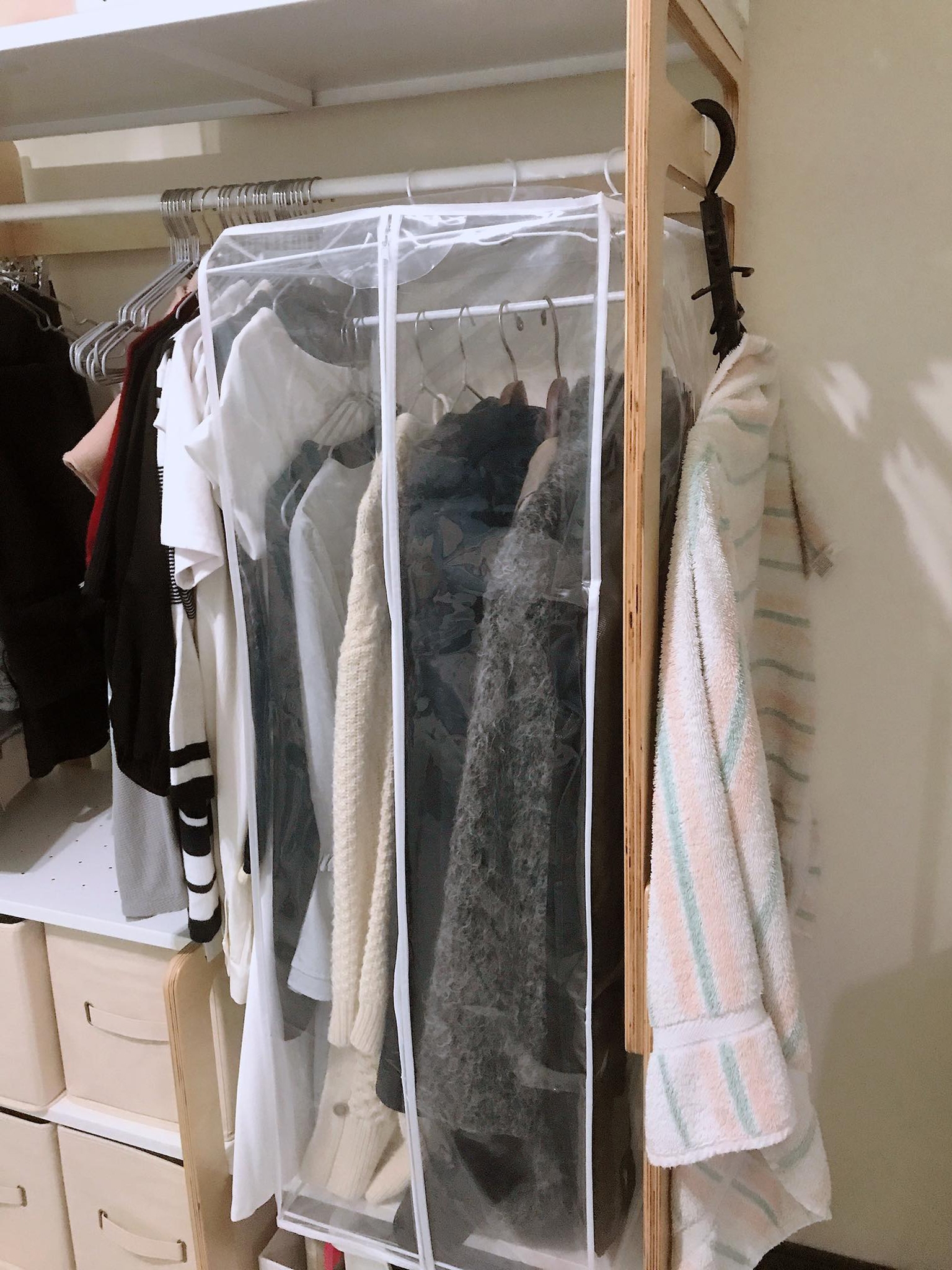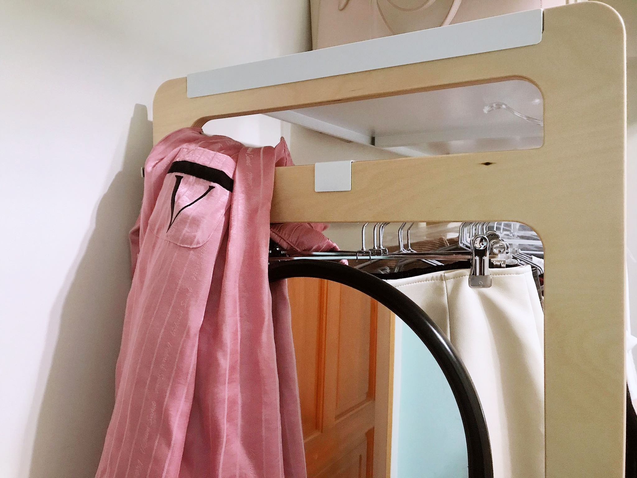 ▲ 這個防塵衣套我當初看到眼睛就亮了~它是一個方形框框,裡面還有一個小桿子,很像多一個移動衣櫥,而且尺寸將將好啊!一般的擴充防塵都是上面蓋塊東西而已,這樣衣服會很難找的感覺。最右邊那是之前diss過的魔術衣架,我拿來掛浴巾哈哈哈。