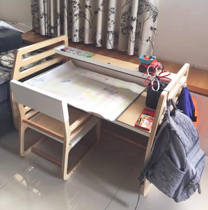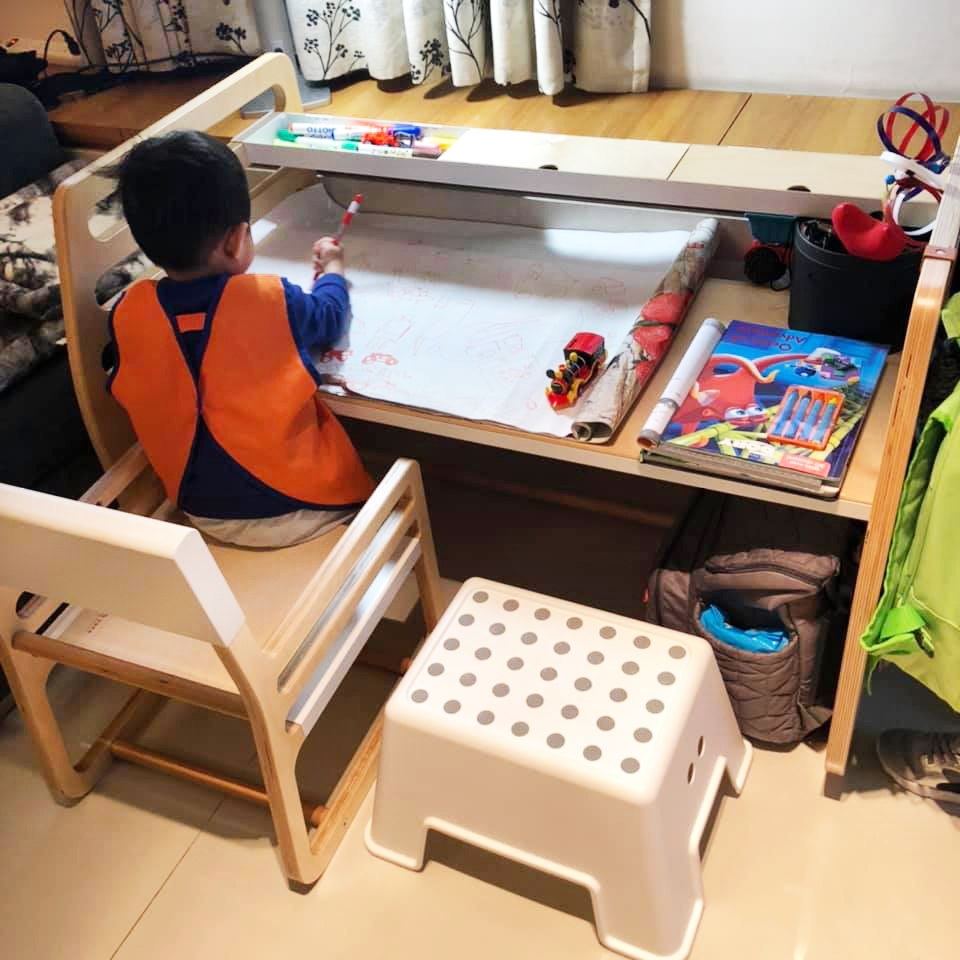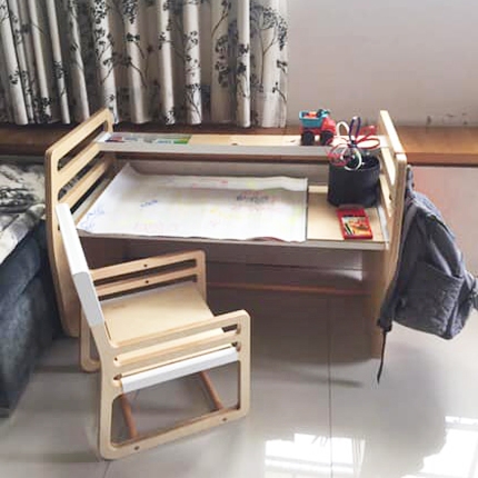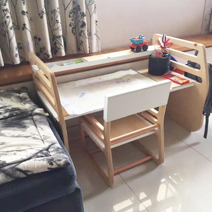 愛畫畫的赫赫每次都在餐桌上畫畫,姿勢不對又危險,看了許多書桌,找不到一個喜歡的。終於有天FB跳出了「走走成長書桌」,木頭的質感,簡約的設計,一看到就決定是你了,立馬贊助。