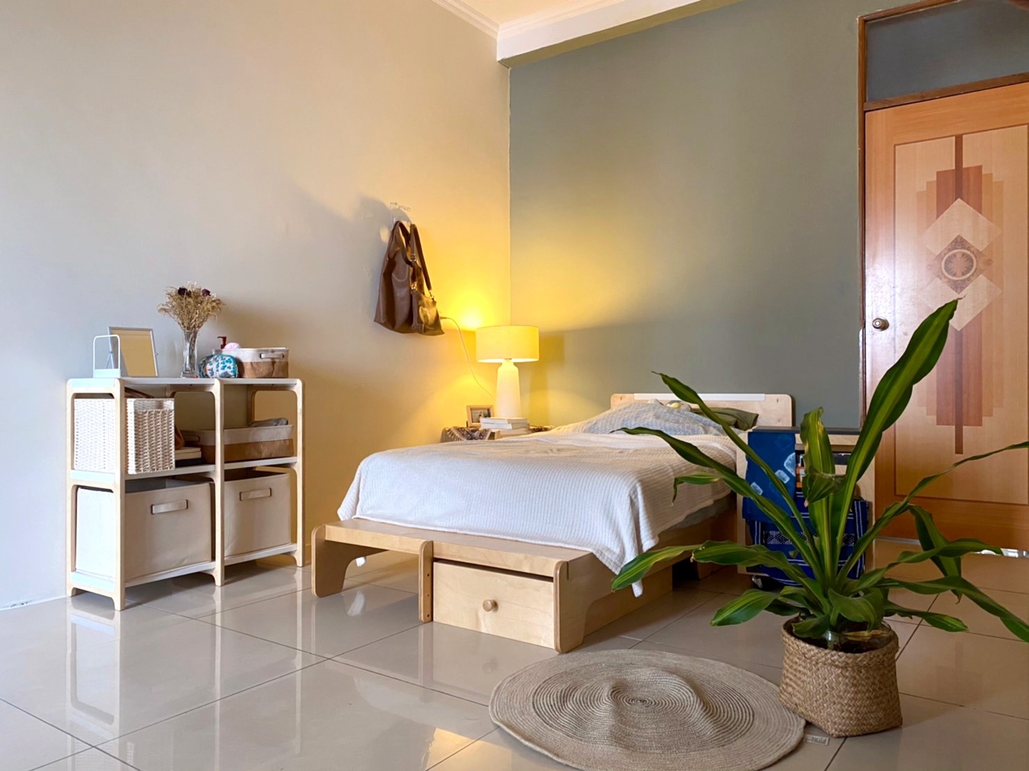 我用的單人床架是首代樣品,床板比實際量產的還要薄,也代表我親自幫大家測試耐用度好一陣子囉 ( #設計師人體測試 #我不怕我驕傲)。床底置物箱則用來放我的瑜珈墊。備註:床墊是單人加大,所以有點凸出去。
