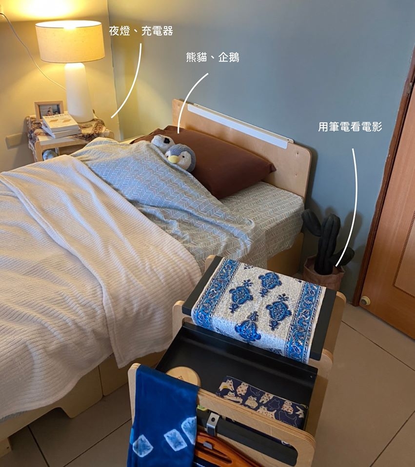 有輪子的邊架是看電影的好夥伴,搭配放零食跟飲料,想吃東西輕輕一拉就到手,想睡覺時候要關電腦也很很方便,如果你跟我一樣也是懶人的話,必推!