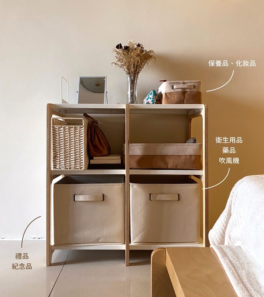 用來放裝飾品、鏡子、保養品跟化妝品...等,搭配置物布籃超好用,放吹風機、個人藥品加上別人送的禮物。