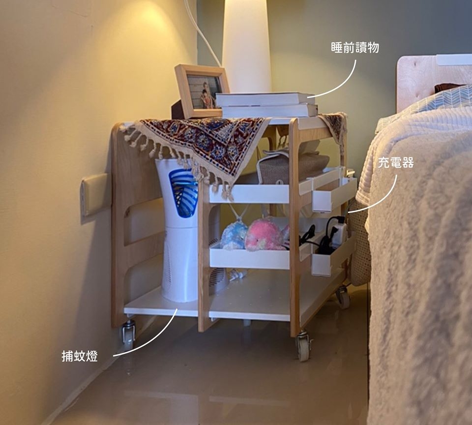 先前某個廠商想採購而特別研發的公文架,跟移動邊架有八成相似,後來合作破局因此就沒有推出,現在唯一的樣品被我用來放夜燈、捕蚊燈、睡前讀物、衛生紙還有充電器。