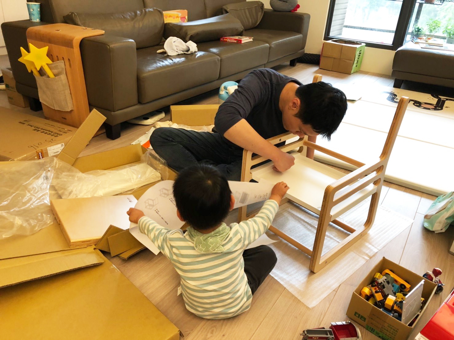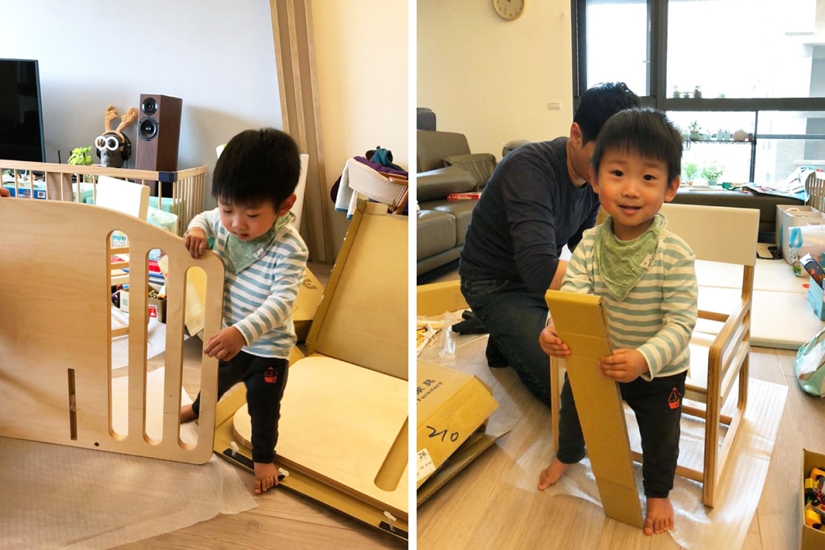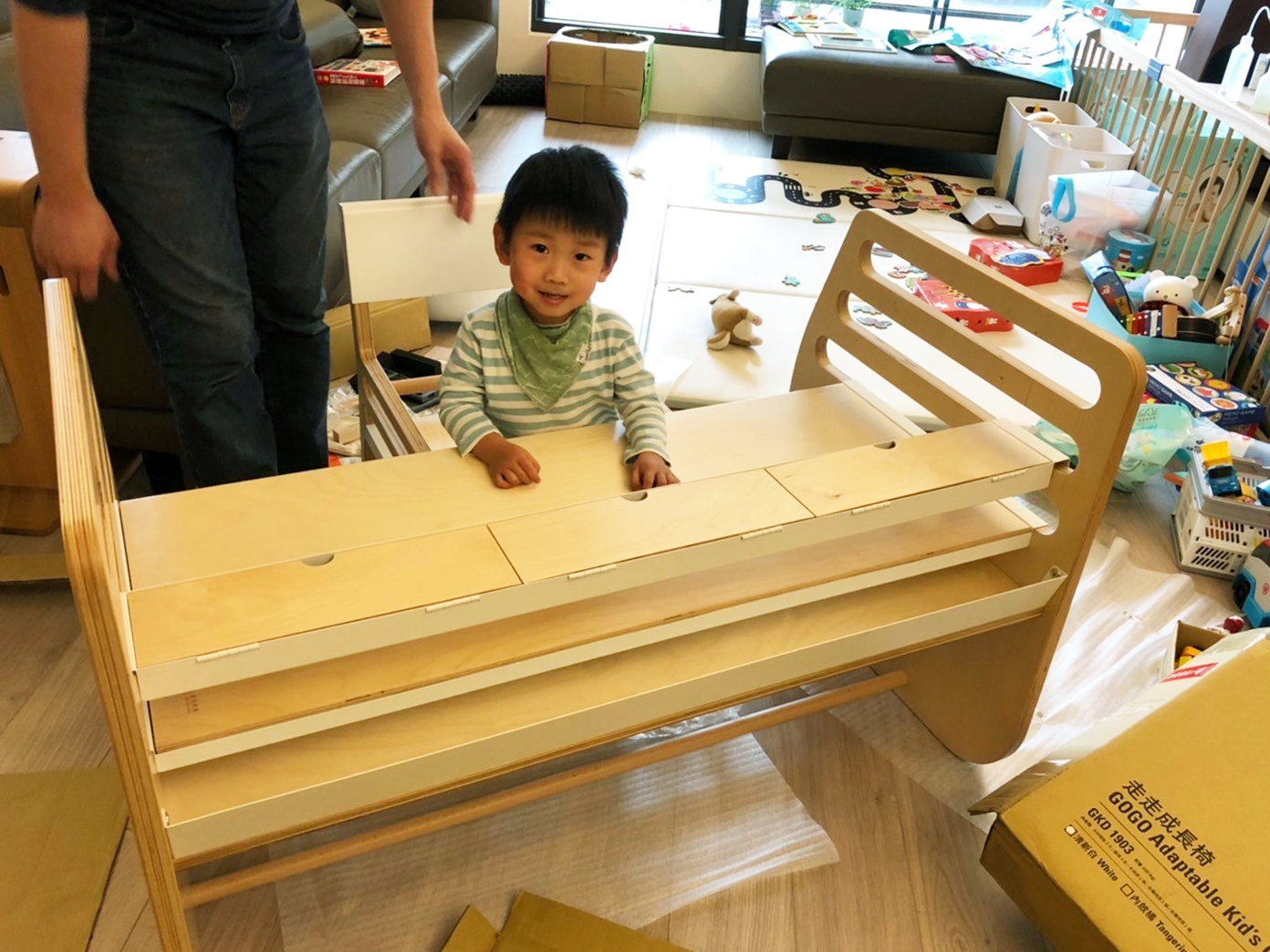漫長等待總算出貨囉,里長伯看完施工圖便開始指揮作業,更親自執行負重耐壓測試。組裝簡單,所有細節都修的圓潤平滑很適合小孩,簡約卻很沉穩堅固,我很滿意。