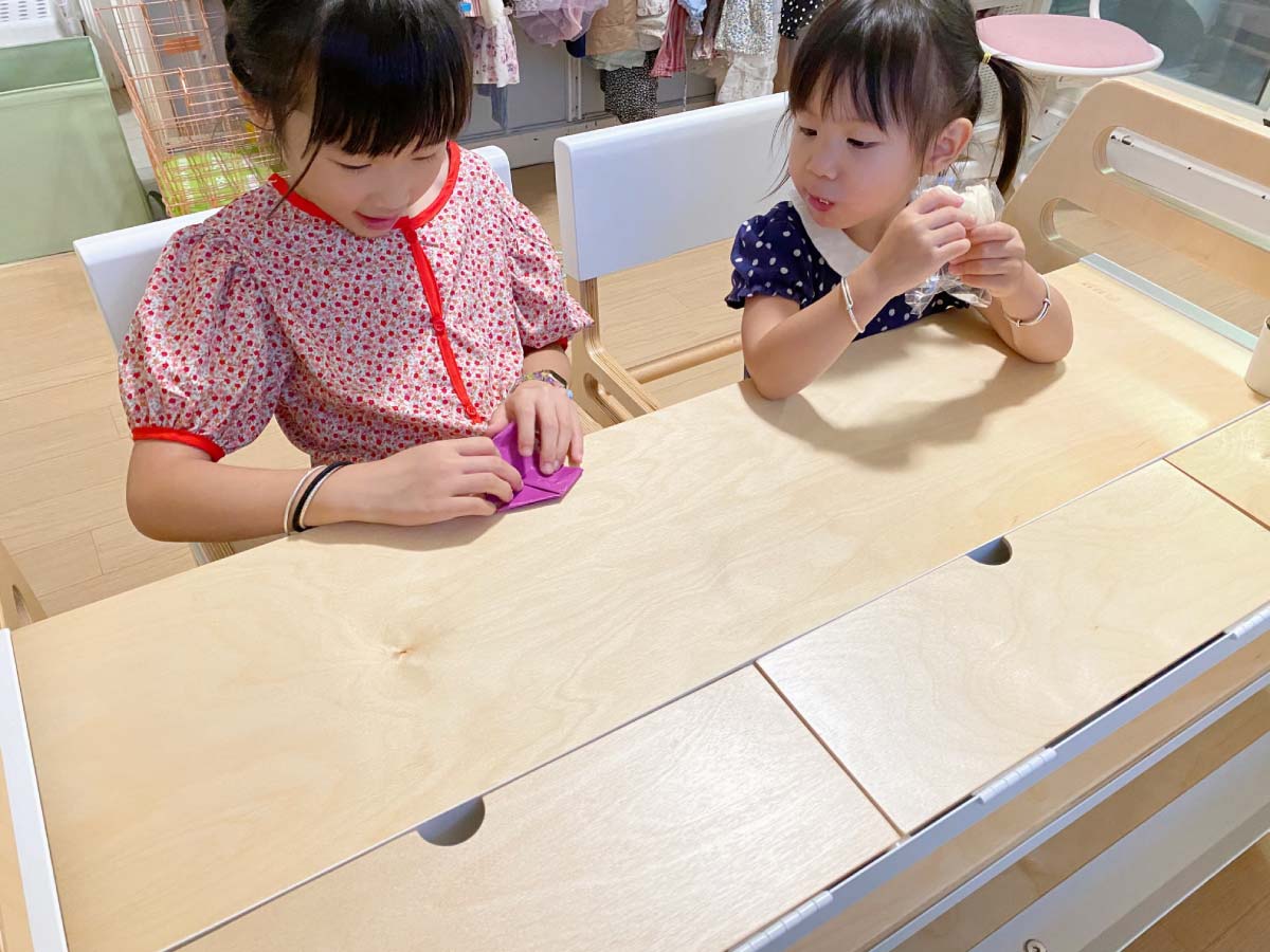 換桌子後,不只是姐姐,連妹妹也有模有樣的,學姐姐坐在桌子前玩著他的玩具。