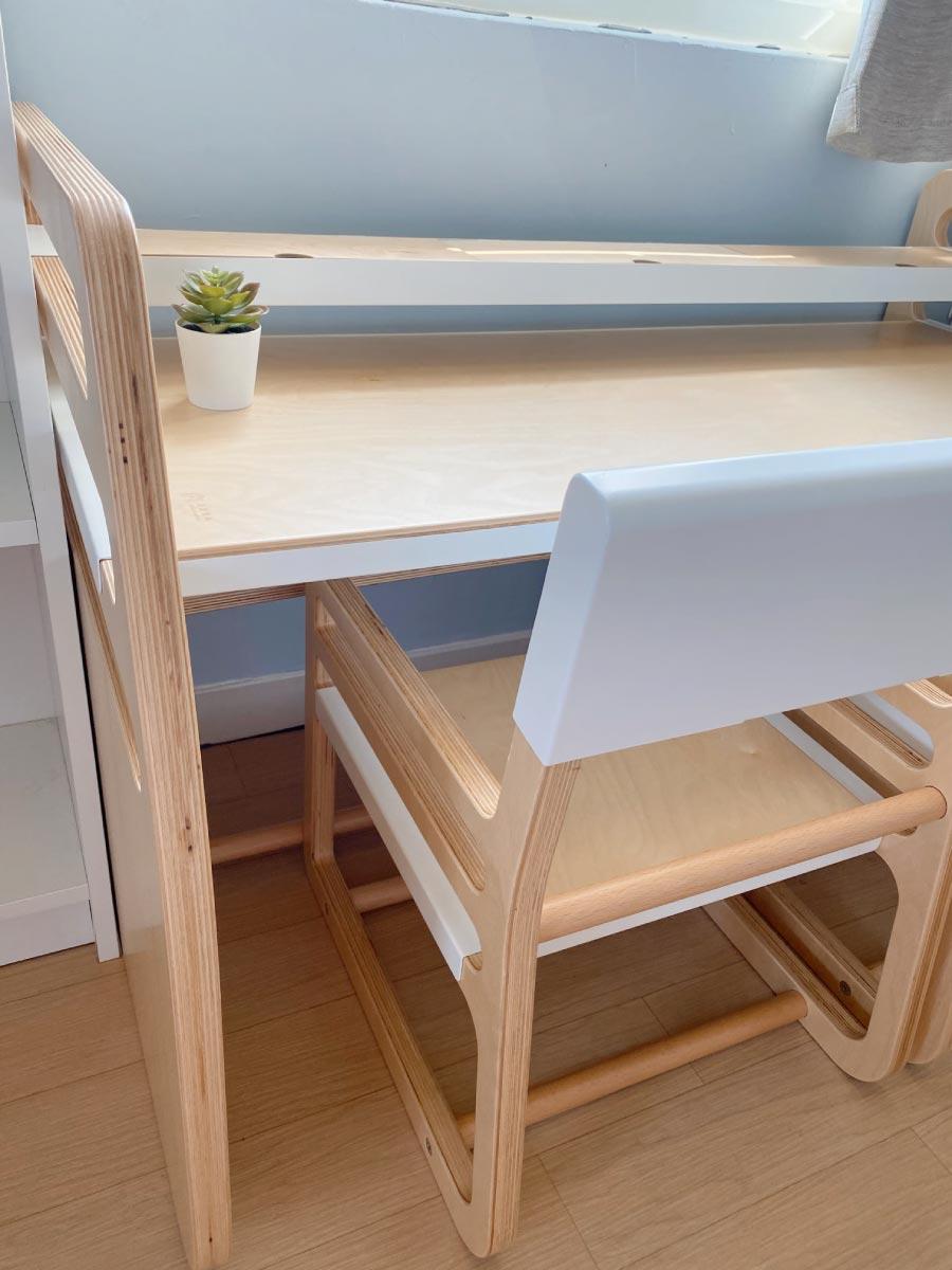 清新白晰的木紋桌,彷彿要把陽光留在桌前陪伴;穩重踏實的椅座,有如成長的基石,穩固每一次學習動搖時刻。