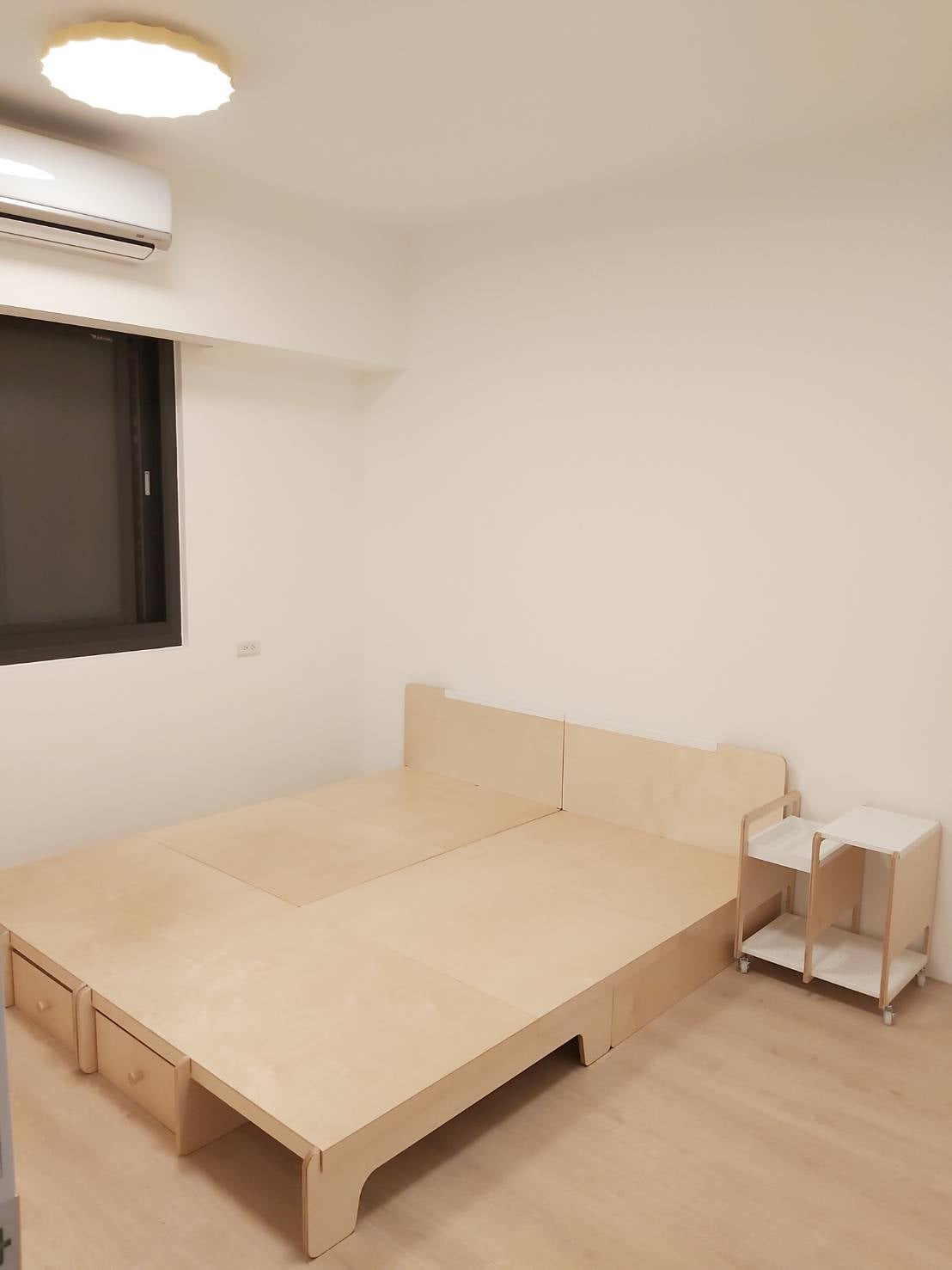 床的部分則是選擇白色的基調,搭配簡單的床邊櫃,放鬆的組合,期待讓寶貝早早進入夢鄉!