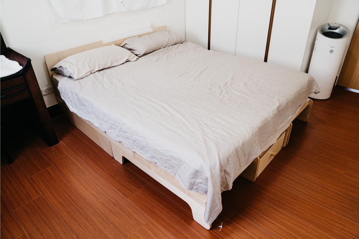 我們只用了一個收納木箱,放著其他地方不好收納的體積澎澎的棉被芯。推進床架下方,貼心的握把讓收納木箱取用起來非常方便,平時依然讓主臥房看起來整潔又寬敞。