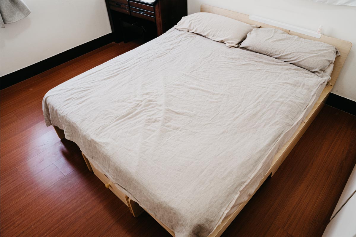 如果有多的空間,人就是會盡可能塞滿的生物。租處房東提供的床架有附床頭櫃,沒想太多就用著,這次更換為走走家具的床架而去整理床頭櫃的時候,裡面塞著搬來以後兩年都沒有用到的床單和被單。仔細一看,原來是過往購入的床單組合花色與現在的房間風格完全不符,我們才始終沒有拿出來使用。趁著這次更換床架,不但果斷捨棄了不合用的床單組合,更重要的是檢視既有的床單數量,我們意識到自己需要的真的不多。