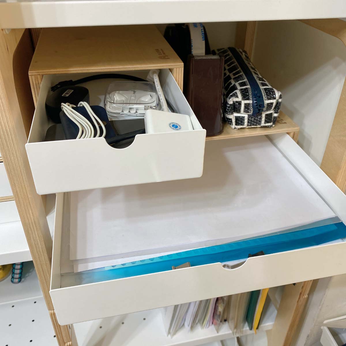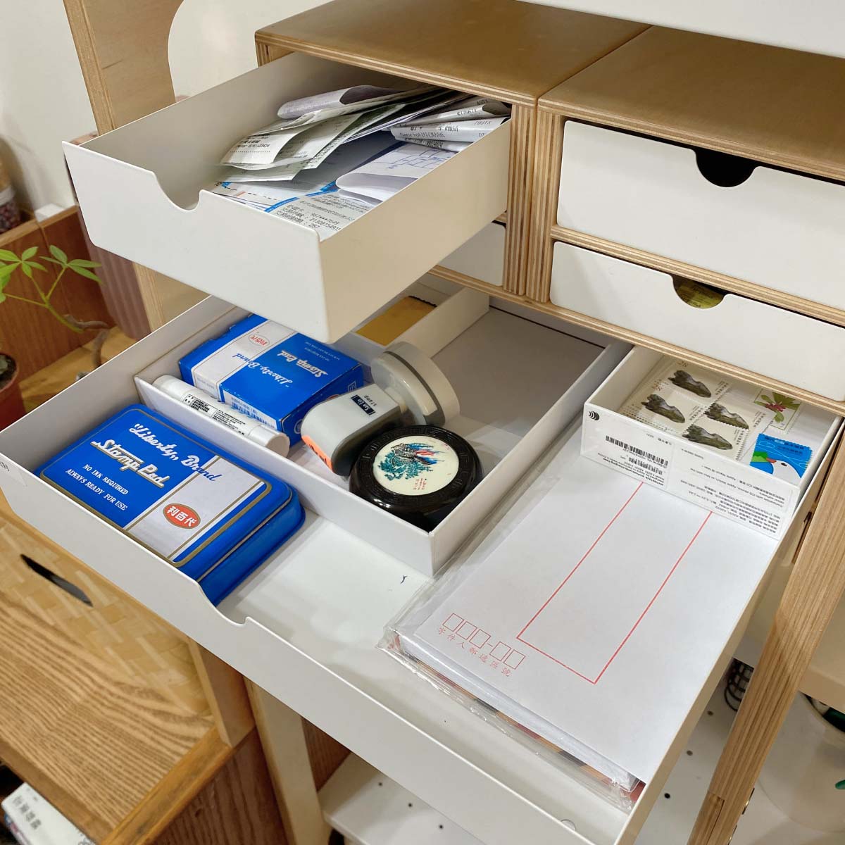 √ 文具雜物 → 收進抽屜/籃子裡面