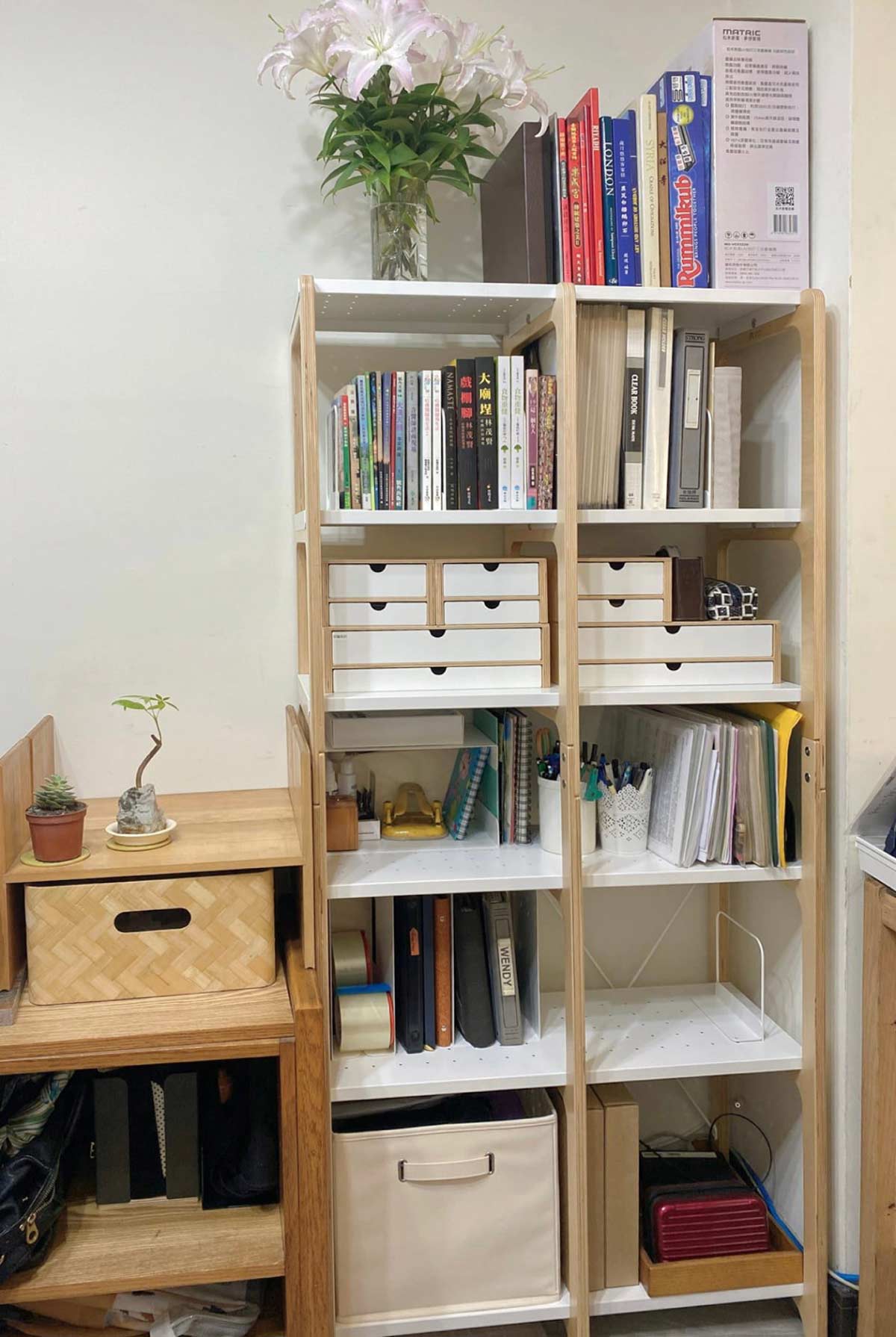 收納用品也都來自走走家具,部分是我們的聯名款!當時是因應開放式架子除了書本跟裝飾品,也可能會放置較零碎的小雜物,所以設計了規格相符的抽屜式收納盒&多功能收納盒。