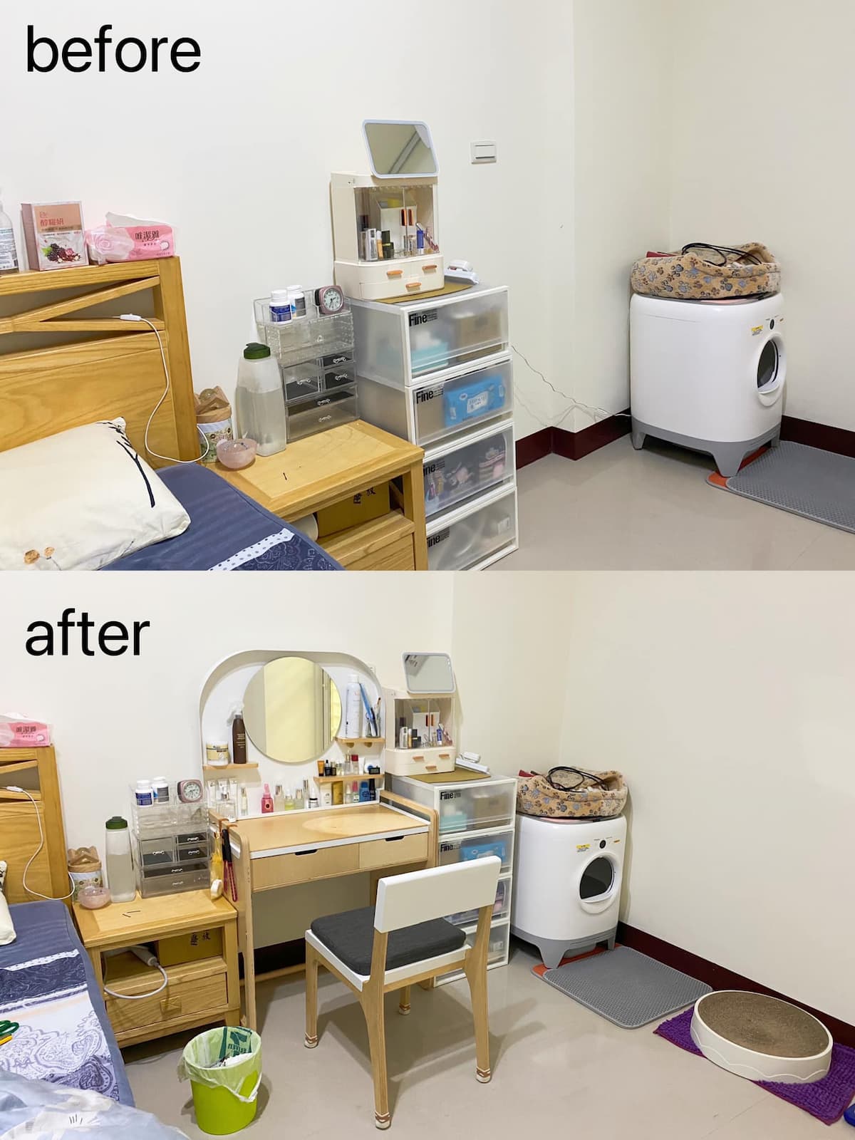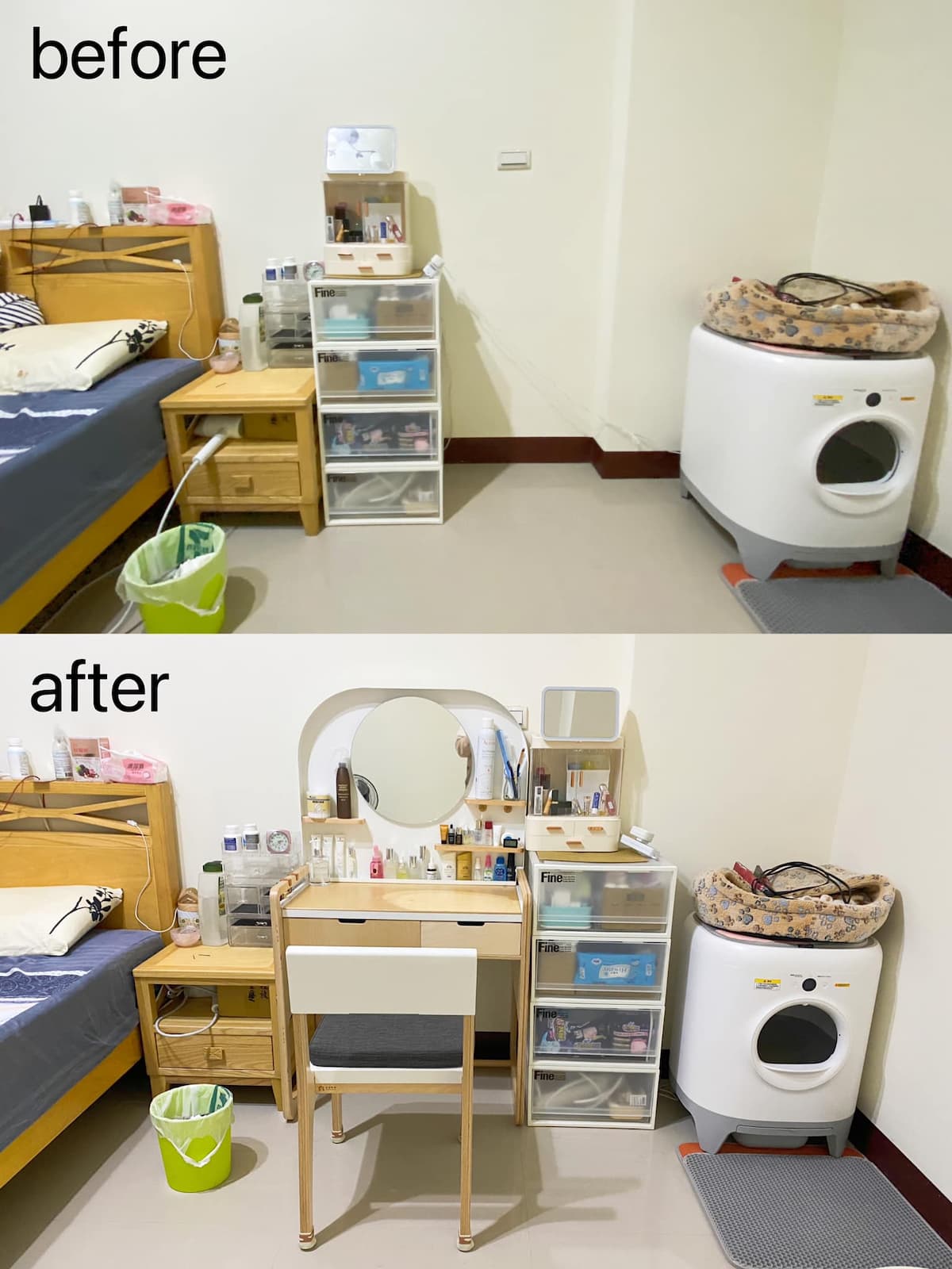 我是一個長年在外租房子的人,一般房東只會附一張書桌供房客使用,果然,我的電腦一放就沒有保養品的位置了,後來我利用四個收納盒組成簡易化妝區,但是,坐著的時候,我會一直撞到收納盒,或是為了近距離看鏡子,我必須一直站著!我保養的時間越久就站越久!導致我越來越節省保養和整理自己的時間,也因為租屋的關係,我怕之後搬家很麻煩!一直很猶豫,而且也找不到喜歡的款式。