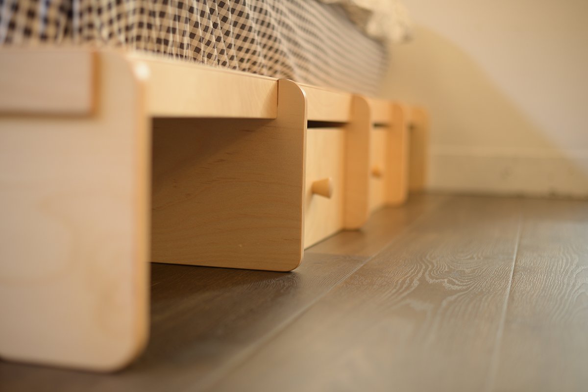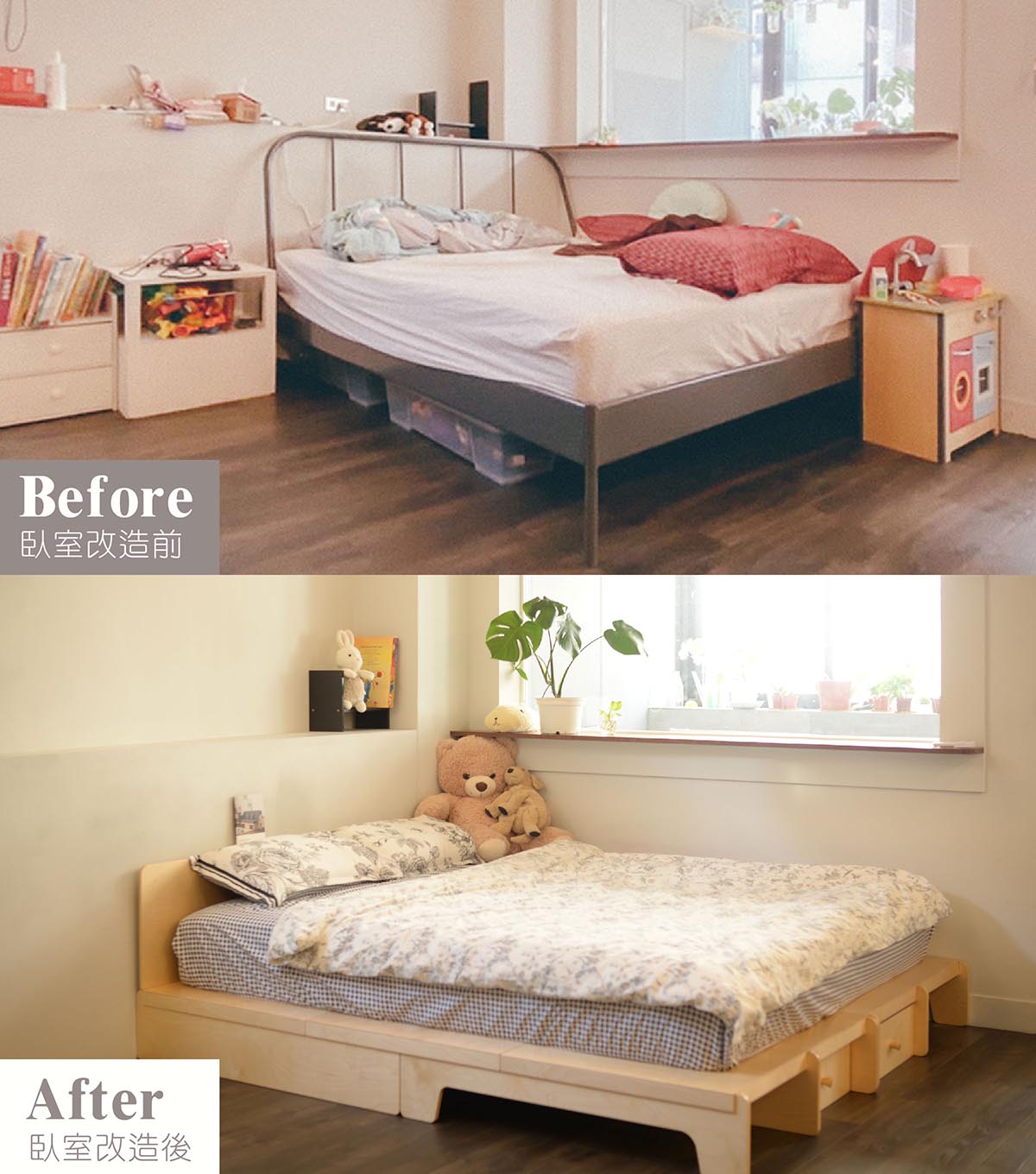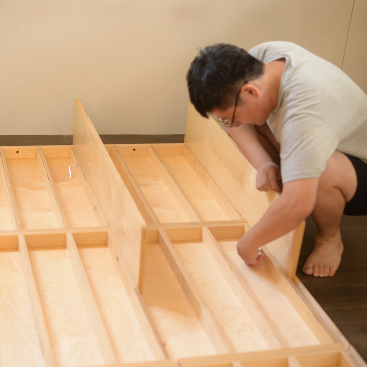 ▲ 完成後的置物箱收納於床板下方,既美觀又能善用空間。